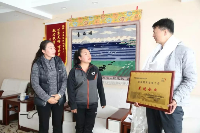 隨后,才旦卓嘎向阜康醫(yī)療股份有限公司黨委書記、董事長王斌頒發(fā)"脫貧攻堅工作先進企業(yè)”匾牌。