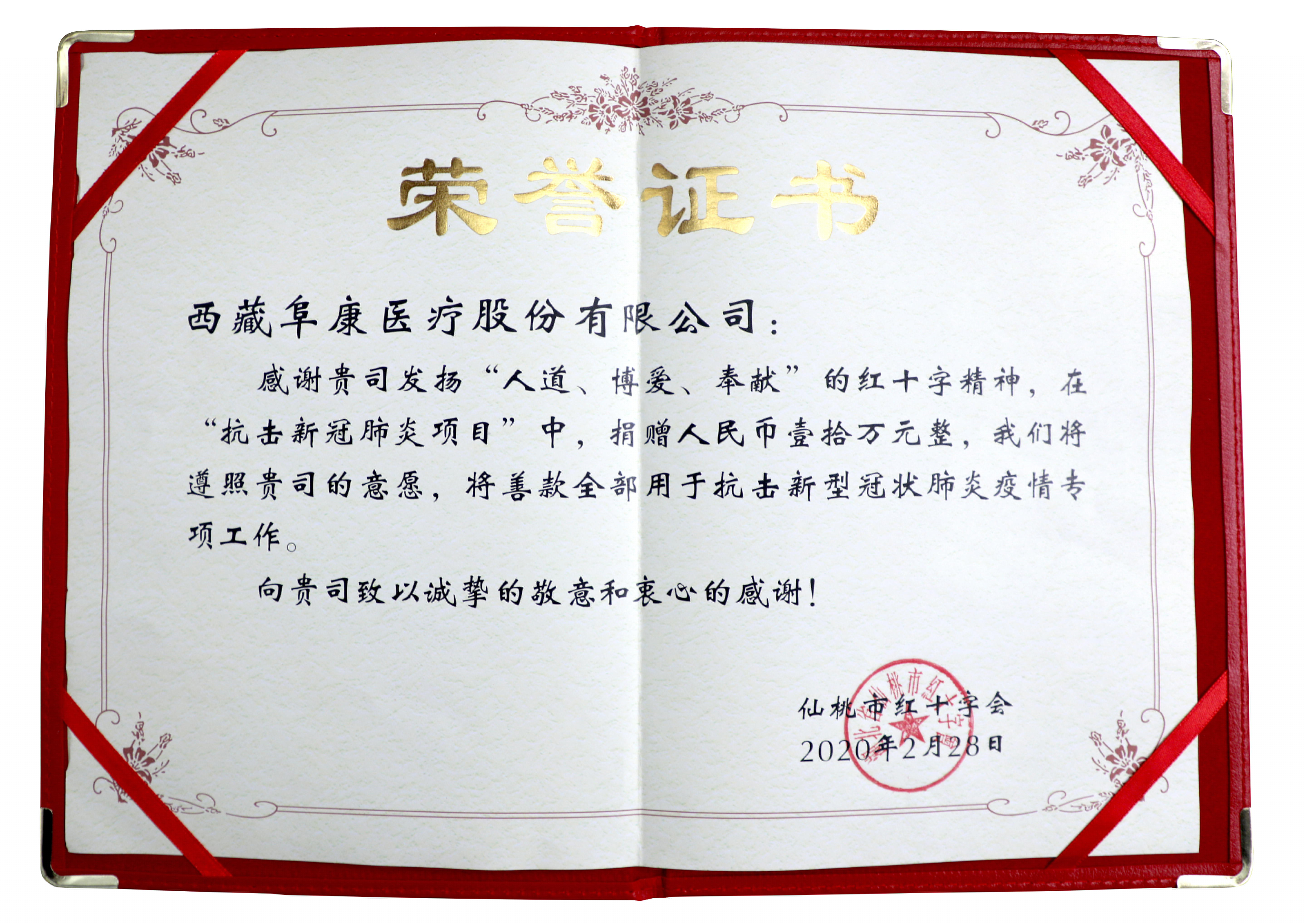 日前,湖北省仙桃市紅十字會(huì)向西藏阜康醫(yī)療股份有限公司寄來一份榮譽(yù)證書,感謝西藏阜康醫(yī)療在全市抗擊新冠肺炎行動(dòng)中發(fā)揚(yáng)"人道、博愛、奉獻(xiàn)”的精神,積極向仙桃市捐款十萬元支持該市"抗疫”工作。