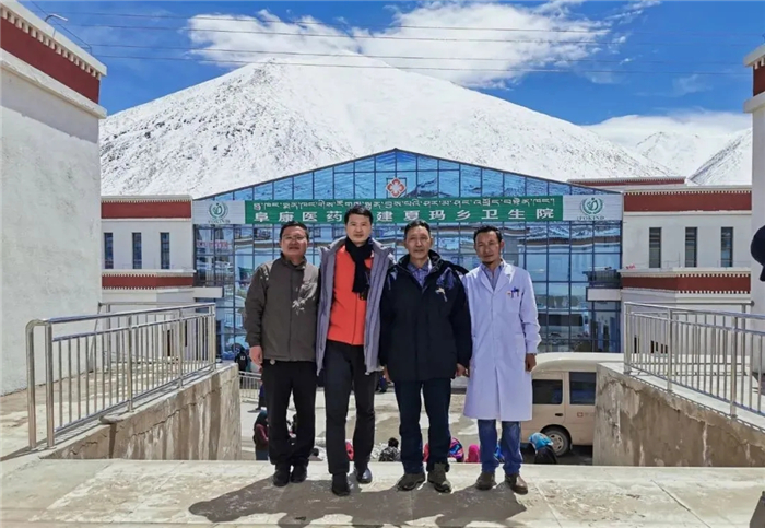 左起:夏瑪鄉(xiāng)鄉(xiāng)長李智安,阜康醫(yī)院王斌董事長,阜康醫(yī)院名譽(yù)院長嘎布,鄉(xiāng)衛(wèi)生院院長東知塵措合影